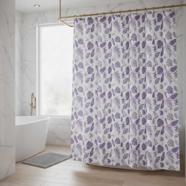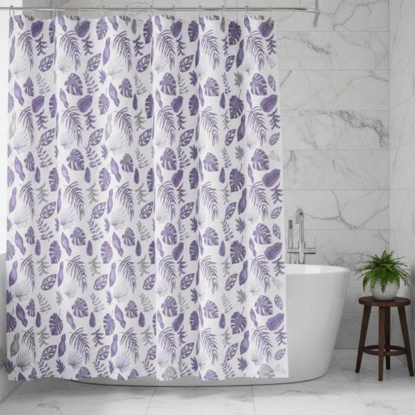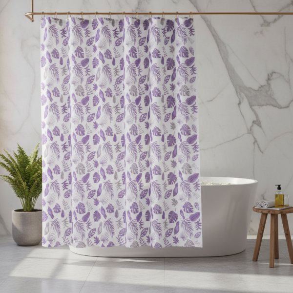 CORTINA PARA BAÑO DOBLE DISEÑO "HOJAS MONSTERAS VIOLETA " PREMIUM