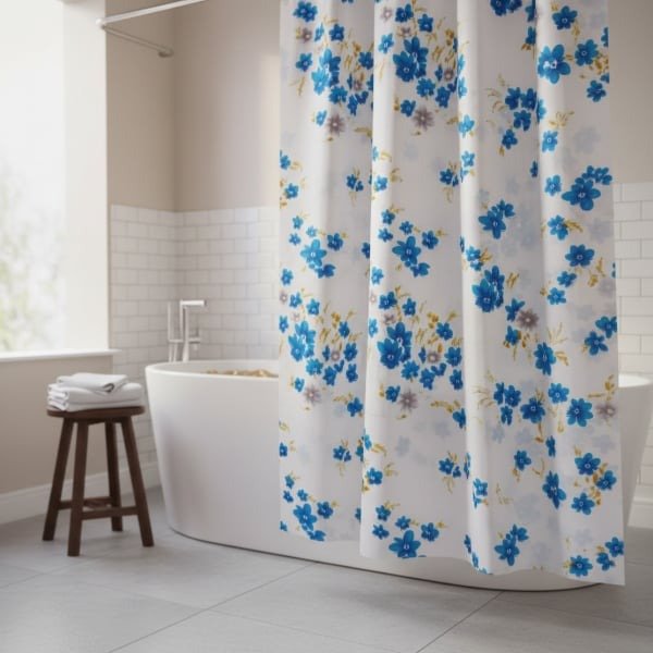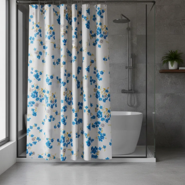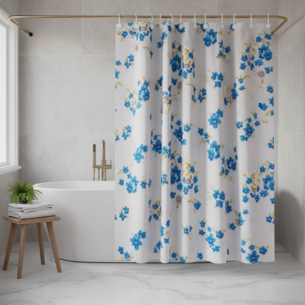 CORTINA PARA BAÑO DE RASO TEFLONADA ESTAMPA FLORES AZUL