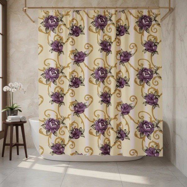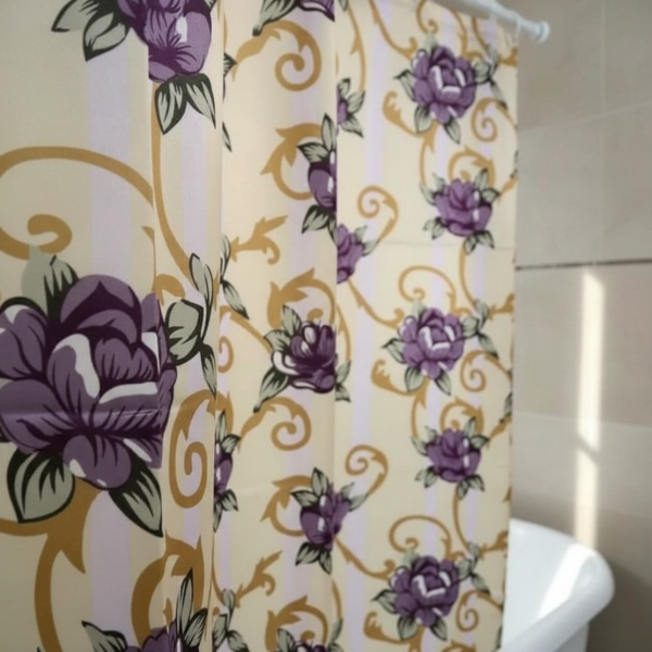 CORTINA PARA BAÑO DE RASO TEFLONADA ESTAMPA "FLORES VIOLETAS"