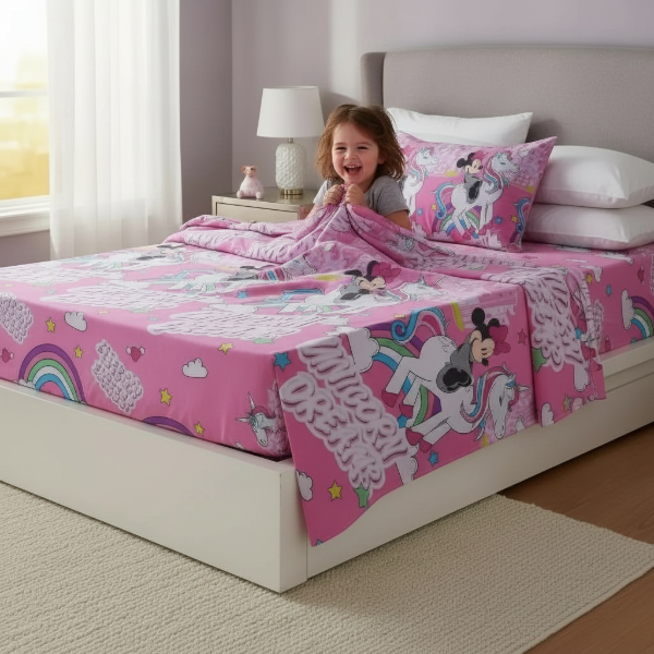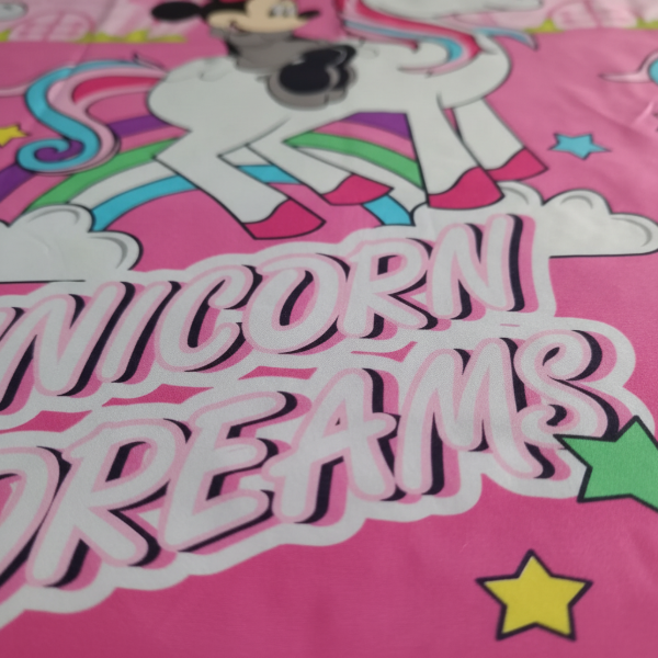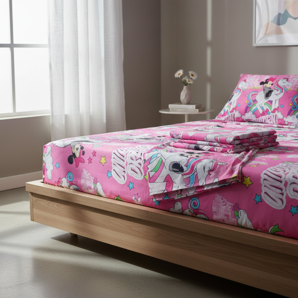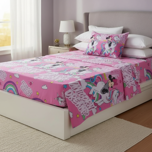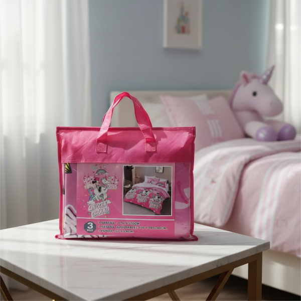 Juego de Sábanas Infantil Twin + Bolso Transportable Diseño "Minnie/Unicornio"