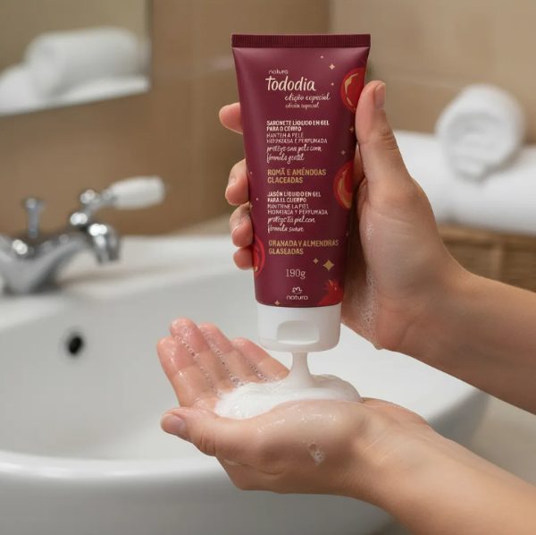 Su fragancia de granada y almendras glaseadas transforma tu rutina de higiene en una experiencia sensorial única.