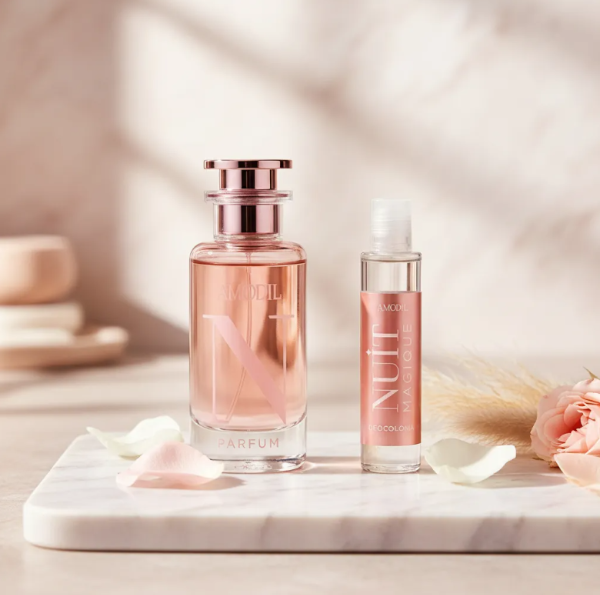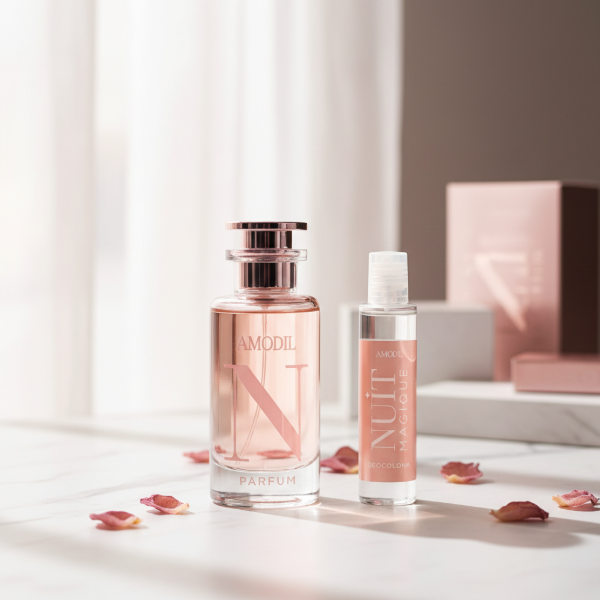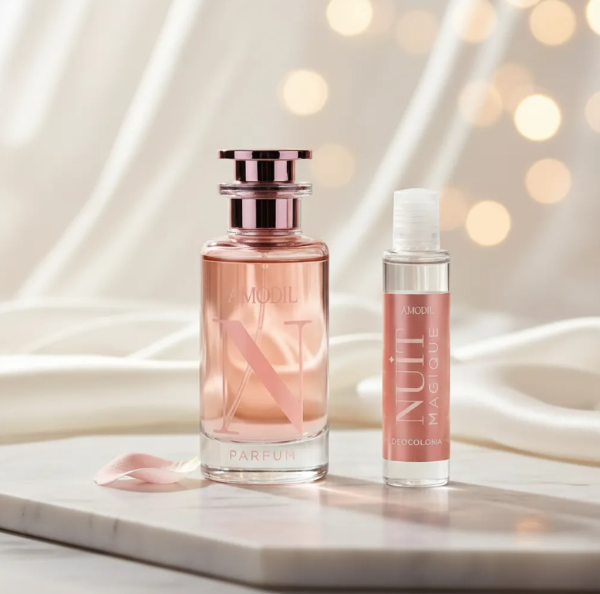 la magía se completa a través de un suave fondo de ámbar, vainilla, cedro y sándalo,
