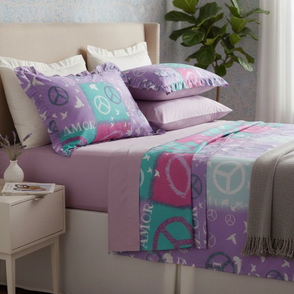 Juego de Sábanas 1 1/2 Pl. "LOVE/PAZ" Infantil Nenas