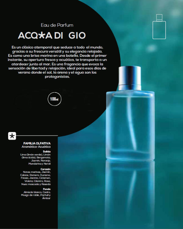 Las Notas de Salida son lima (limón verde), limón (lima ácida), bergamota, jazmín, naranja, mandarina y neroli;